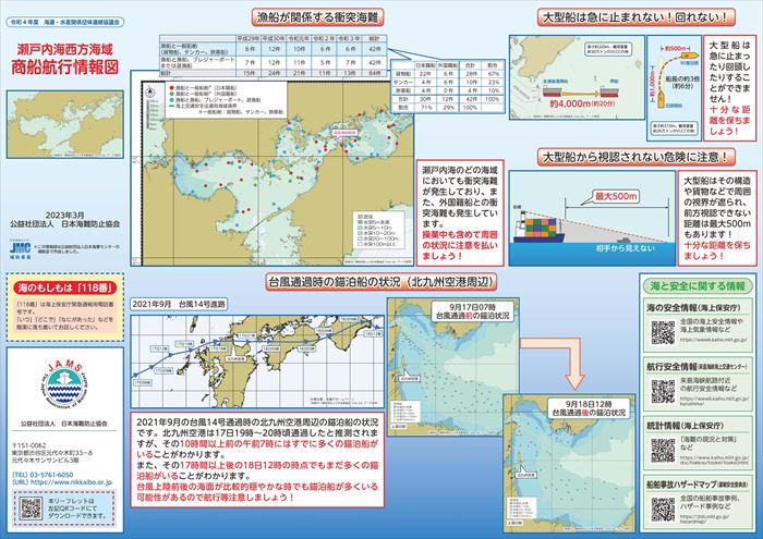 瀬戸内海西方海域商船航行情報図は、来島海峡航路等を含む瀬戸内海の西方海域(広島県、山口県、愛媛県、福岡県及び大分県)を航行する主な一般通航船舶とその特徴などを掲載しています。