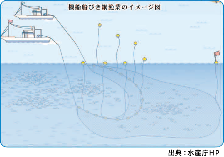 船を拠点として網をひき寄せるか、1隻または2隻間の船尾に網をひき廻して、表層または中層の魚を獲る漁業です。瀬戸内海西方海域で行われる機船船びき網漁業は、主に船型3〜10トン未満の漁船2隻で行われることが多く、それぞれに1〜2名が乗っています。漁は地域によって様々な時期、時間帯に行われます。