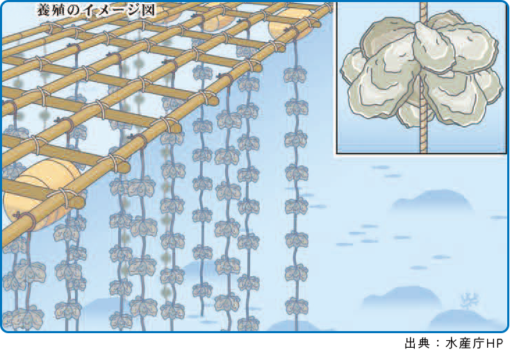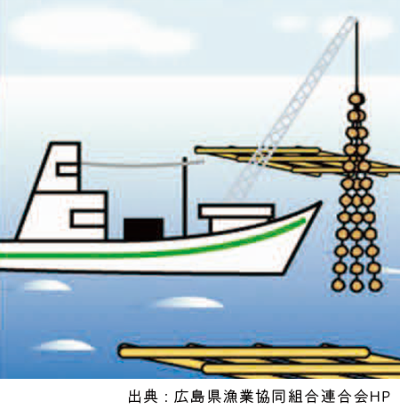 筏等を設け、そこでカキやノリ等といった魚介類を成長させて収穫する方法です。瀬戸内海西方海域で行われる養殖は、その収穫に船型20トン未満の漁船が使用され、2〜3名が乗っています。例えば広島県のカキ養殖では、ロープに吊るした種カキを、淡水の影響のある河口付近で約1年間育て、さらに餌となるプランクトンの多い治岸の海域に筏を移動してから、約1年間育てます。