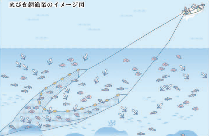小型機舲底びき網漁業とは、漁船の船尾から海底に接するように網をひき、魚介類を獲る漁です。