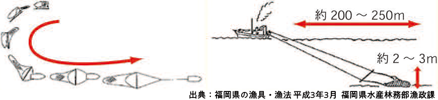 漁法はそれぞれの種類、また同じ種類でも県や地域によって異なったりと、同じ小型機船底びき網漁業でも一概に同じものではありません。ここではその一例として福岡県の「えびこぎ網」の漁法を参考掲載しています。