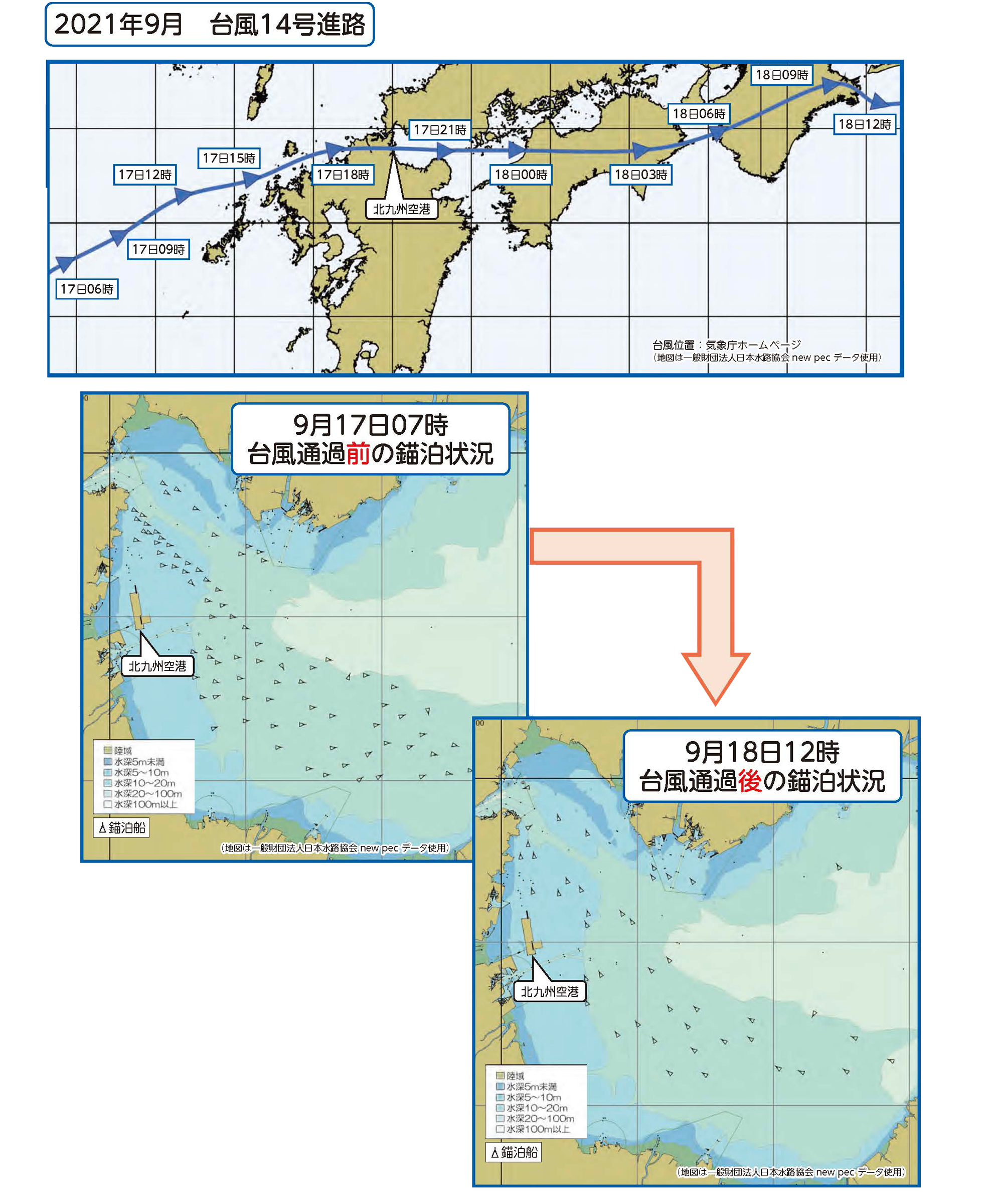 台風通過時の錨泊船の状況(北九州空港周辺)